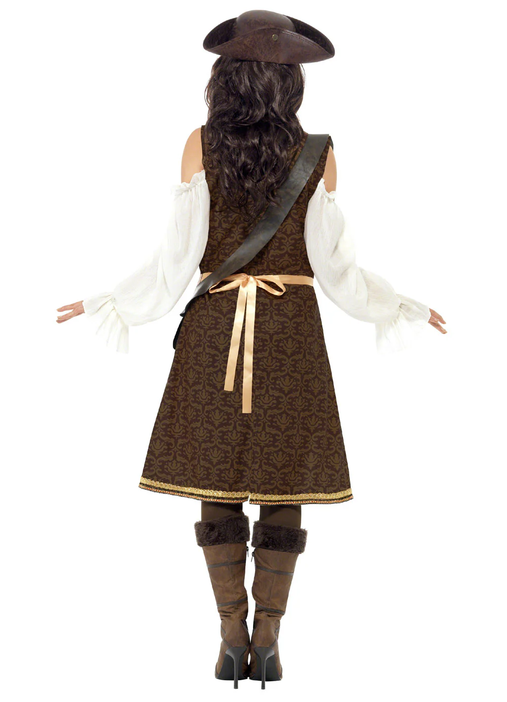 Outfit includes long draped top with gold trim and red decorative front panel, brown three quarter length trousers and a baldric.