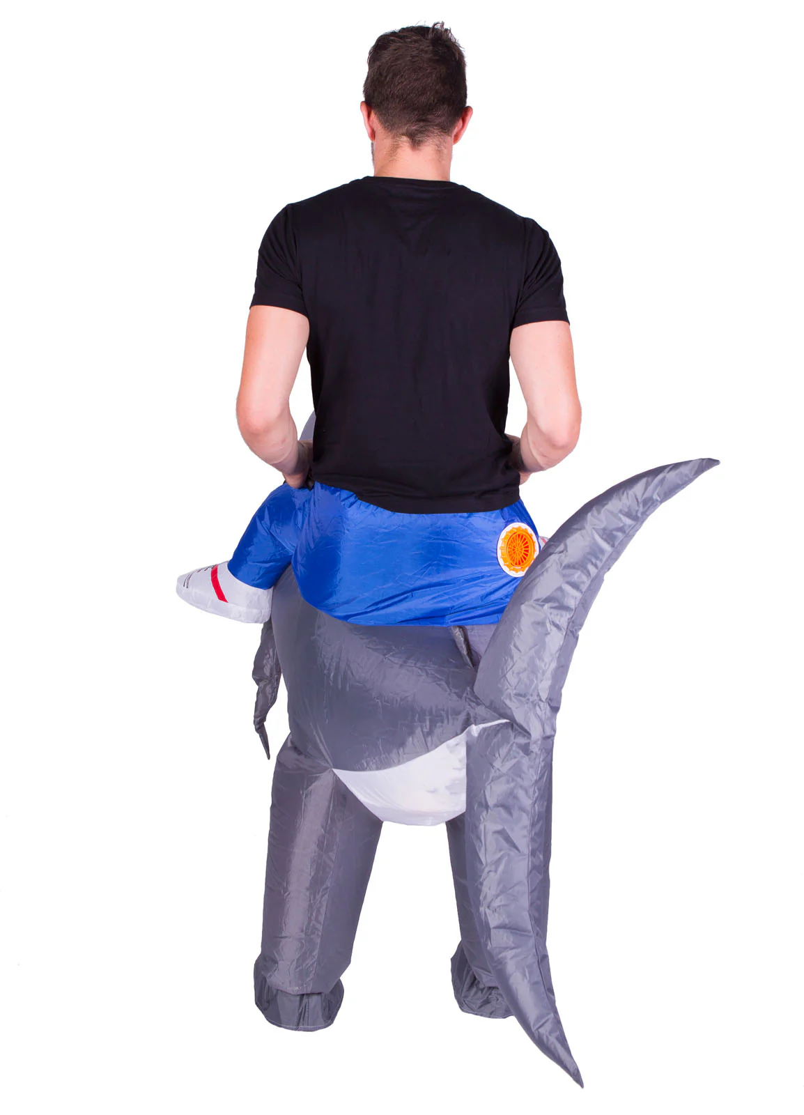 Inflatable Ride On Shark fancy dress costume consisting of half body jumpsuit with attached shark & built in fan. Perfect for a party, stag do or festival.