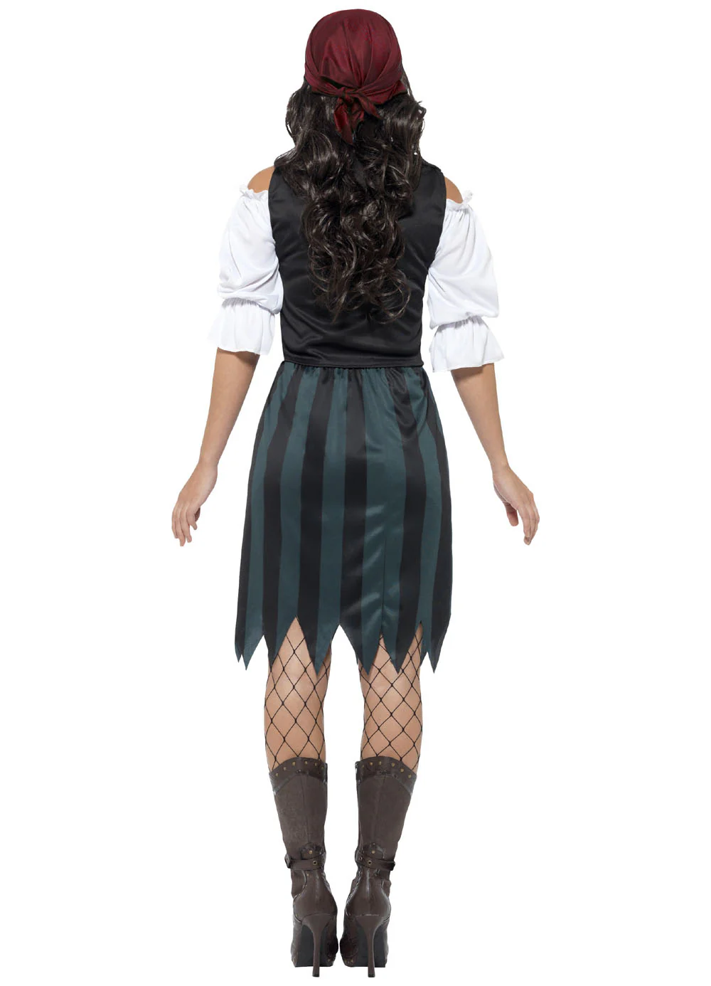 Pirate Deckhand fancy dress costume consisting of white ruffled shirt with attached black mock waistcoat, black and green striped skirt, brown belt with buckle & matching red bandana.